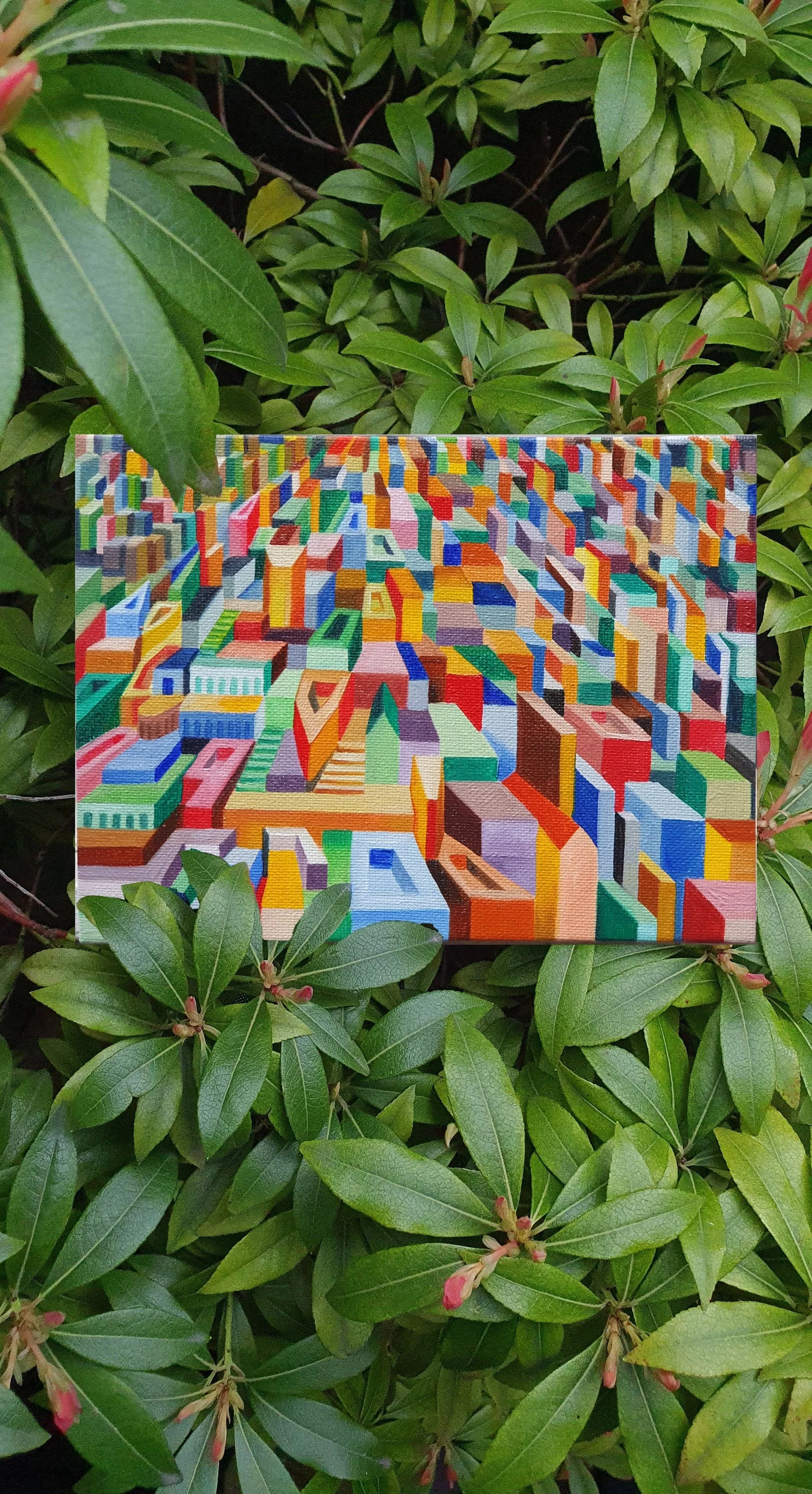 unveils a profound exploration of the human condition within the urban landscape. Executed during a transformative art residency at NDSM Art City, the paintings encapsulate the city as a multifaceted human invention, a canvas reflecting society's intricate tapestry. Each work delves into the human role as both creator and beneficiary of the city. Human figures, shadows, city volumes, and intricate details intertwine to depict universal themes. The sequence commences with reflections on historical transformations, moving from exchange cities like Venice to the monumental human project. The artworks ponder the spatial dynamics of city, nature, and emptiness - a mathematical equation for the shadow's reach, consuming the planet. “City dust” portrays the human amidst an urban carpet, a faint individual supported by the city's infrastructure. The narrative takes a hopeful turn with “The Effort”,symbolizing the collective endeavor to heal the landscape's wounds. Looking to the future, the artworks envision a new version of the past - a medieval center, a perched city, a contrasting yet necessary vision. The journey climaxes with “Let’s flood in love,” where humanity accepts its fate while aspiring to design a harmonious, nature-integrated city. From Venice to Amsterdam, Hamburg to New York, it's the contemporary dream realized. In its culmination, the visual odyssey extols the city as a living artwork, an eco-system where humanity's smallest and greatest reward is the creation of a harmonious, nature-aligned habitat.